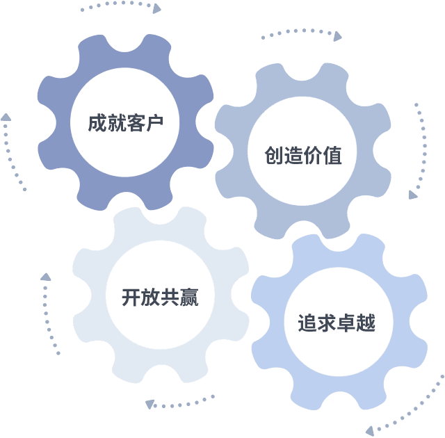 成就客户是一切决策的出发点,,,,创造价值是衡量所有工作的标准,,,,追求卓越是我们做事做人的态度,,,,开放共赢是我们的格局也是最终的结果。。。价值观的齿轮环环相扣,,推动着组织里的每个人不断向前。。。